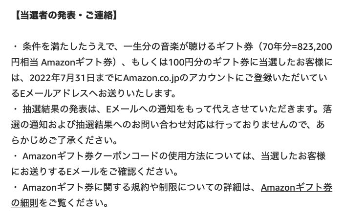 A. 一生分の音楽が聴けるギフト券(70年分=823,200円相当 Amazonキ゛フト券)(抽選1名様)