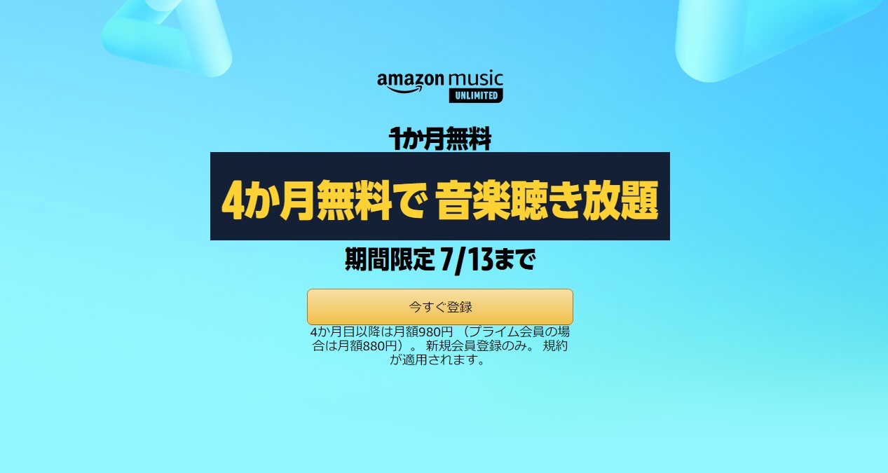 Amazon Music Unlimited 4ヶ月無料(7/13まで)