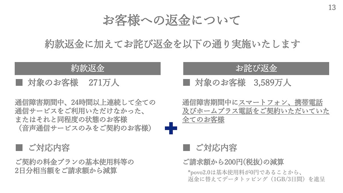 約款返金は音声のみ契約、271万人で2日間相当を減算、それとは別に3589万人にお詫び返金として200円。