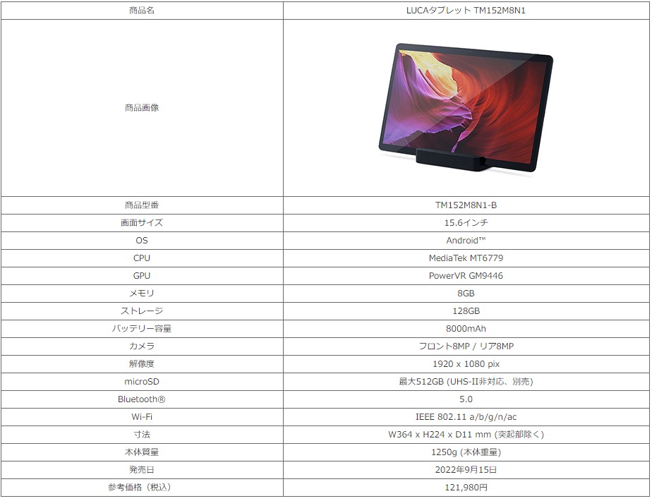 15.6インチの広々画面 Web会議やオンライン授業、家族で画面シェアなど用途多彩 「LUCAタブレット TM152M8N1」を新発売|2022年|ニュース|企業情報… https://t.co/Yqnee5N1AJ