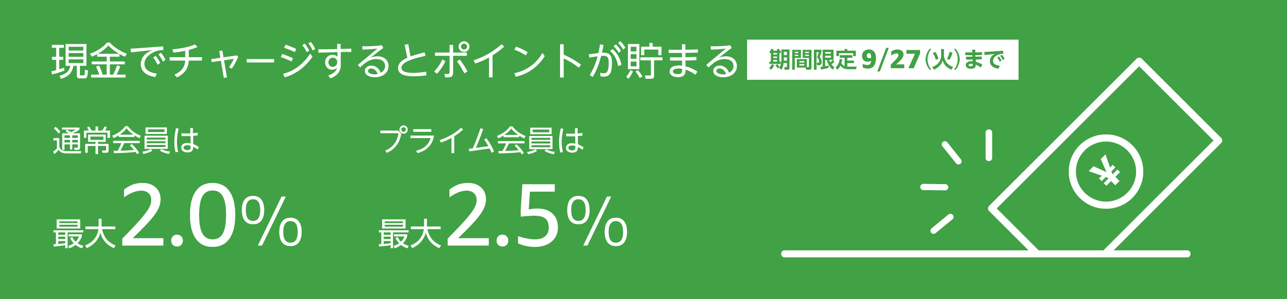 現金でチャージするとポイントが貯まる 通常会員最大2%・プライム会員は最大2.5%(9/27まで)