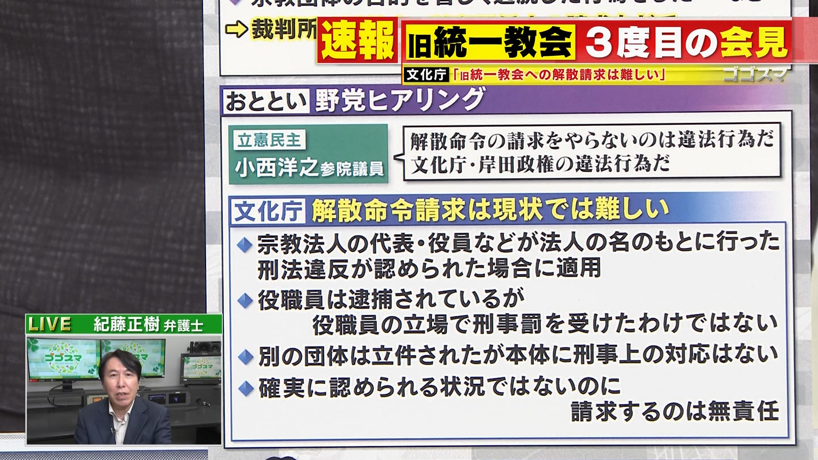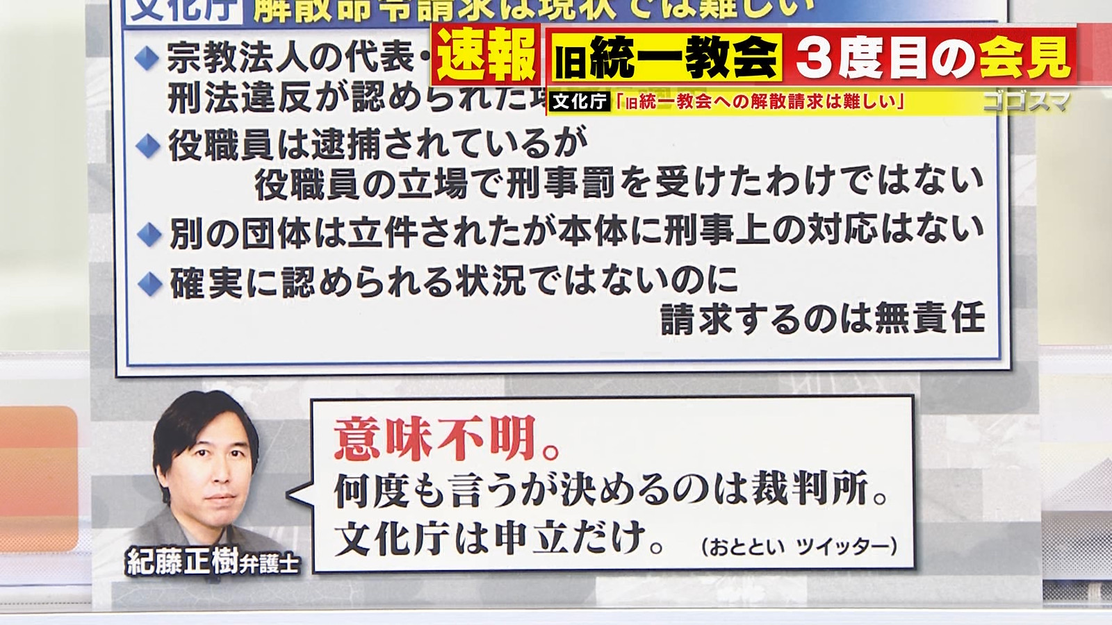 旧統一教会の解散命令「裁判所への請求は難しい」文化庁