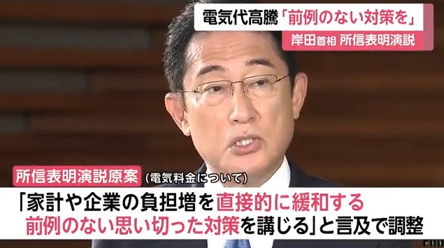 政府関係者によると、演説原案では、電気料金について、 「2023年春にかけて急激な値上がりのリスクがある」と指摘したうえで、 「家計や企業の負担増を直接的に緩和する前例のない思い切った対策を講じる」 と言及する方向で調整しているという。