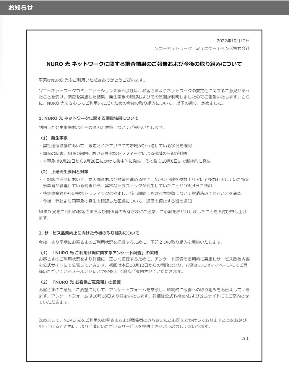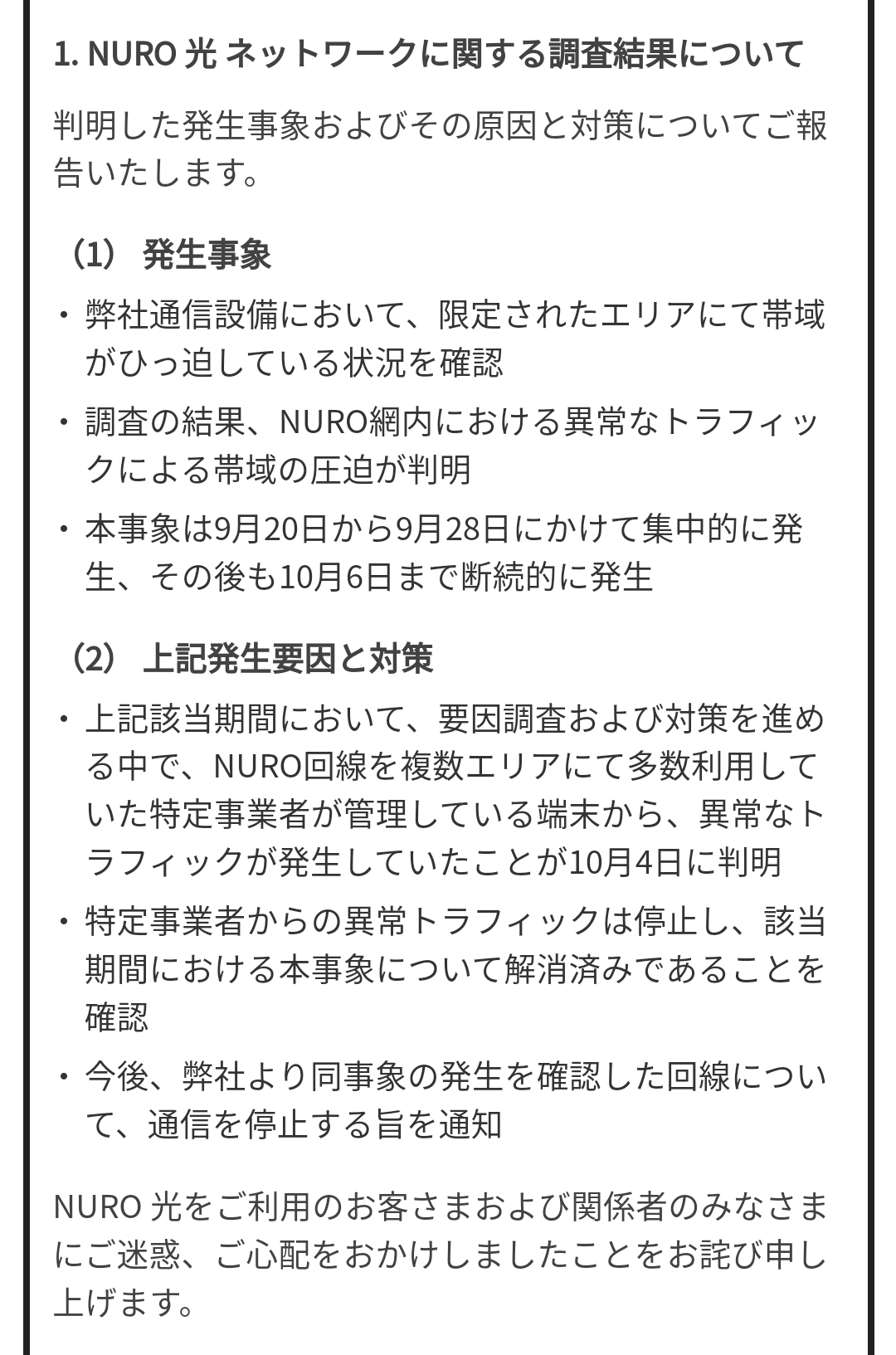NURO 光 ネットワークに関する調査結果のご報告および今後の取り組みについて