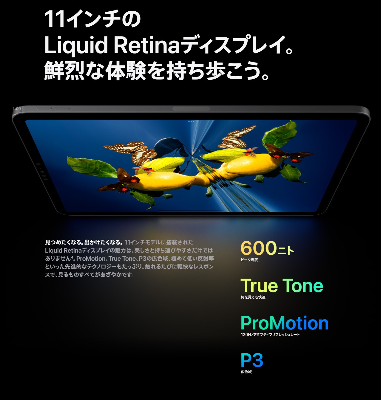 - ディスプレイ:11インチ(2388×1668・IPS・120Hz・600nit)、ProMotion、TrueTone、耐指紋性撥油コーティング、フルラミネーション