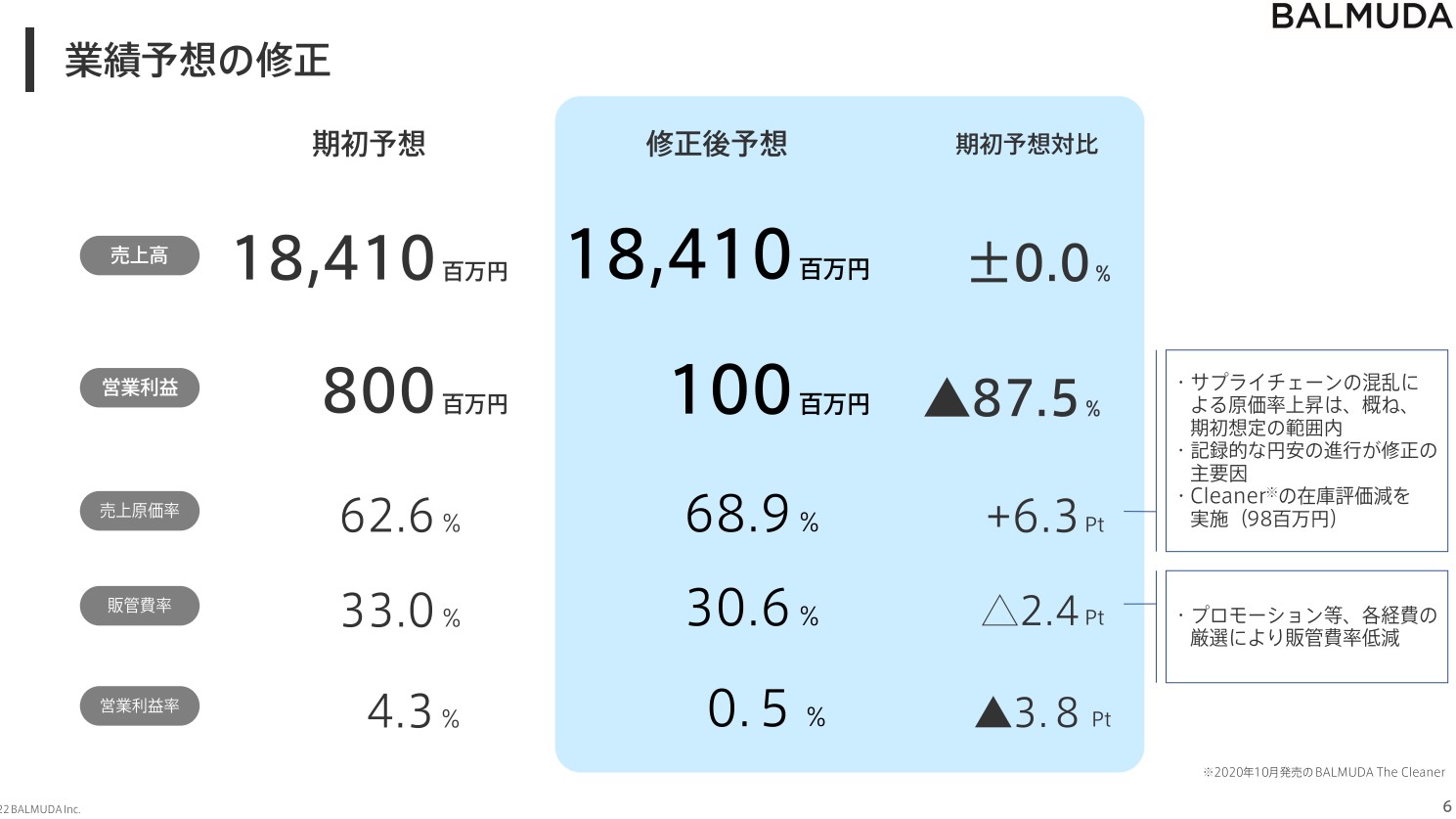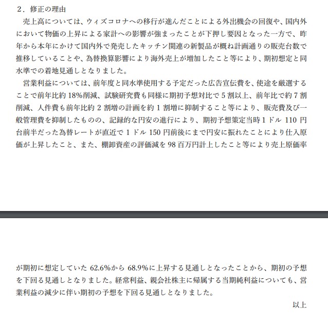 バルミューダ売上は好調だけど円安が悪いのと掃除機が死ぬほど売れなかったことについてが修正理由としてるな