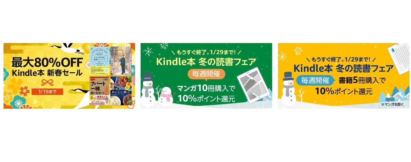 Kindle本 冬の読書フェア マンガ10冊まとめ買い10%還元、書籍5冊まとめ買い10%還元(1/29まで毎週開催)