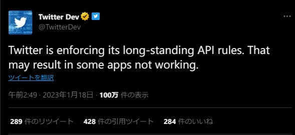 Twitter、サードパーティアプリ停止は「APIルール施行の結果」(どんなルールかは説明なし)