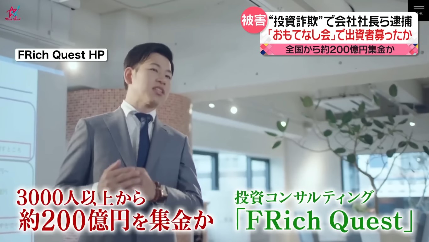 東京都新宿区の投資コンサルティング会社「FRich Quest(フリッチクエスト)」社長の森野広太(38)と同社社員の計8人を詐欺容疑で逮捕