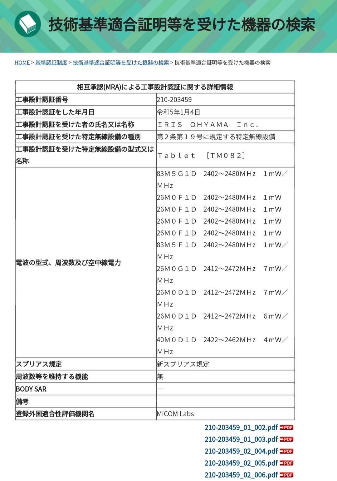 https://www.tele.soumu.go.jp/giteki/SearchServlet?pageID=jk01&NUM=210-203459&NAM=&FOM=&PC=&YAR_FROM=&MON_FROM=&DAY_FROM=&YAR_TO=&MON_TO=&DAY_TO=&RAD=00-00-00-00&TEC=1&TEC=2&TEC=3&TEC=4&TEC=5&TEC=6&TEC=7&SK=0&DC=0&SC=1&as_fid=8ba7ea37f5f51d6536a90f570235013964066734#searchlist
