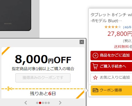 最初10%OFFってクーポンが出てくるけど横を押すと他のクーポン出てくるな