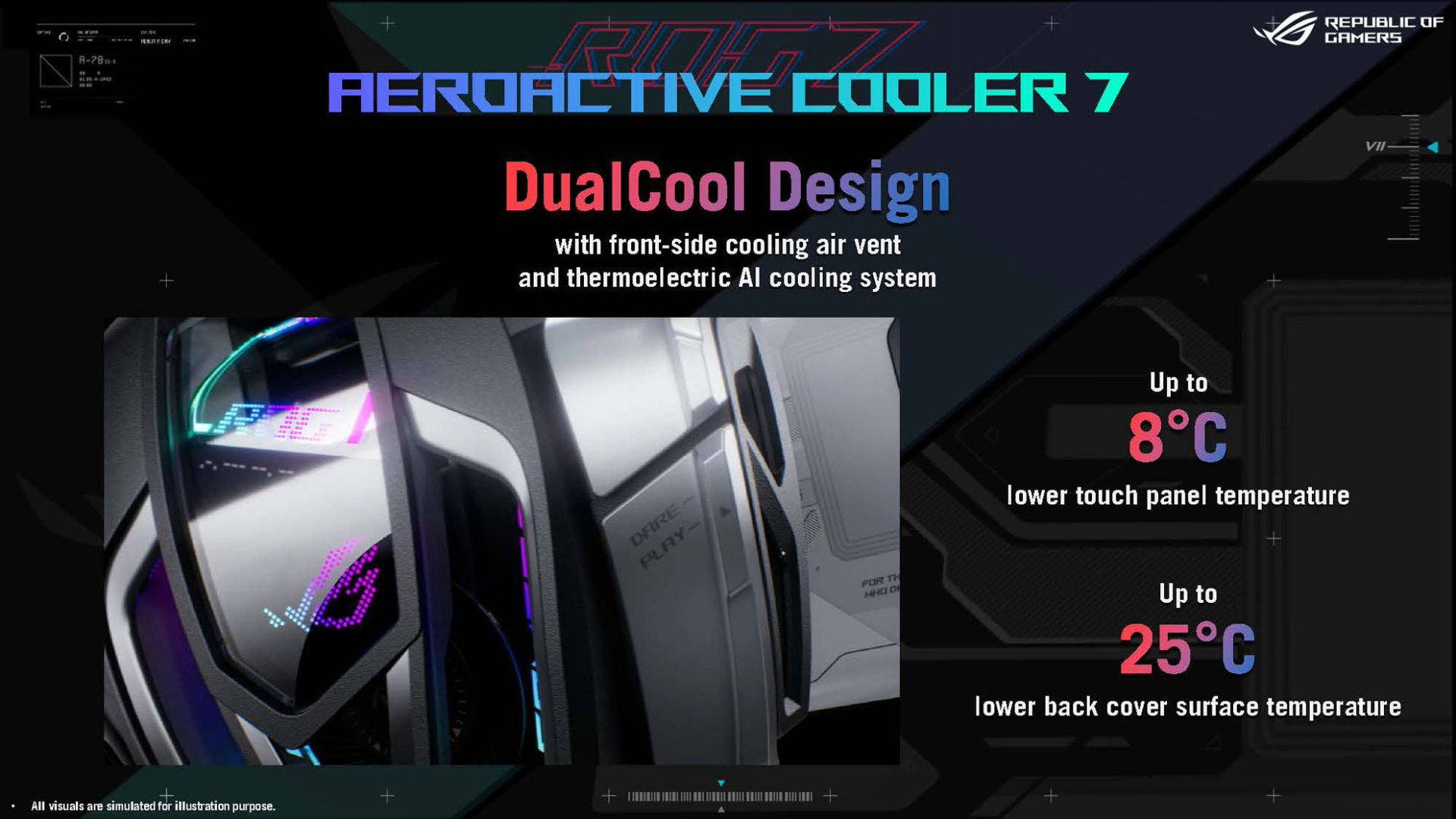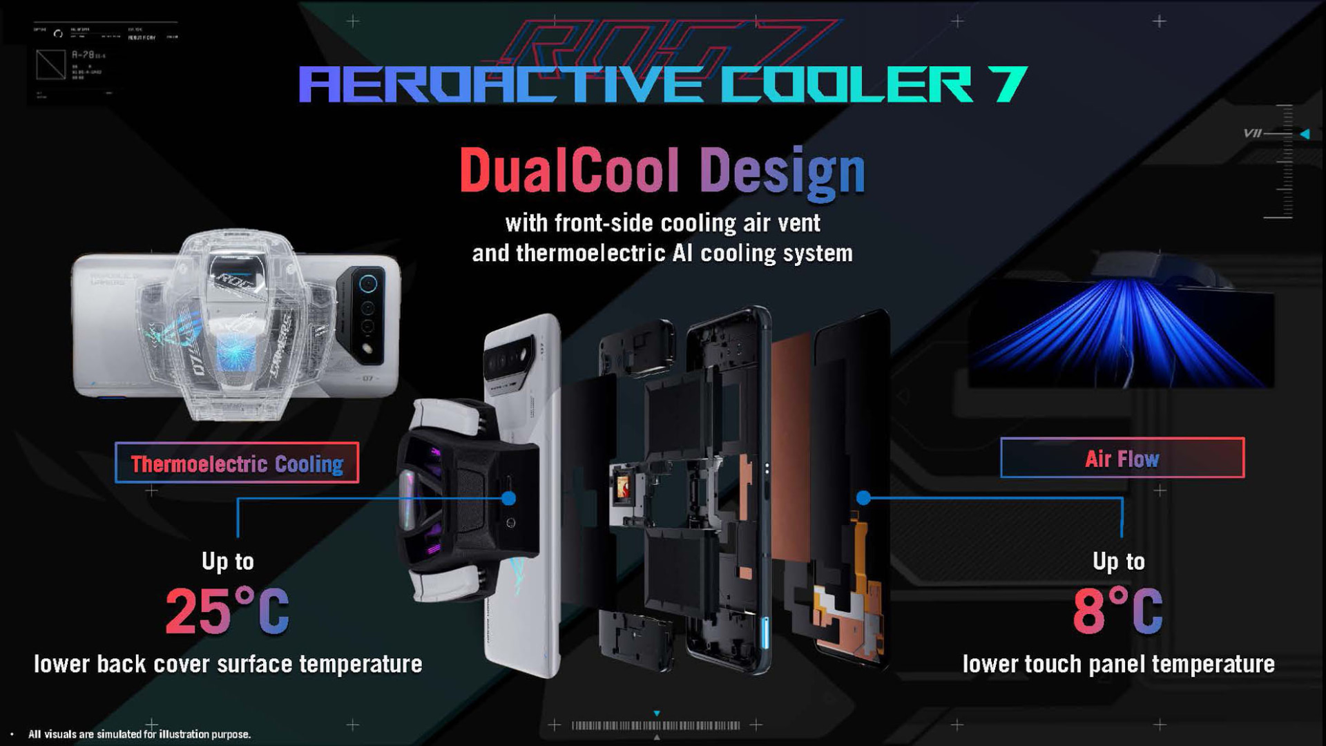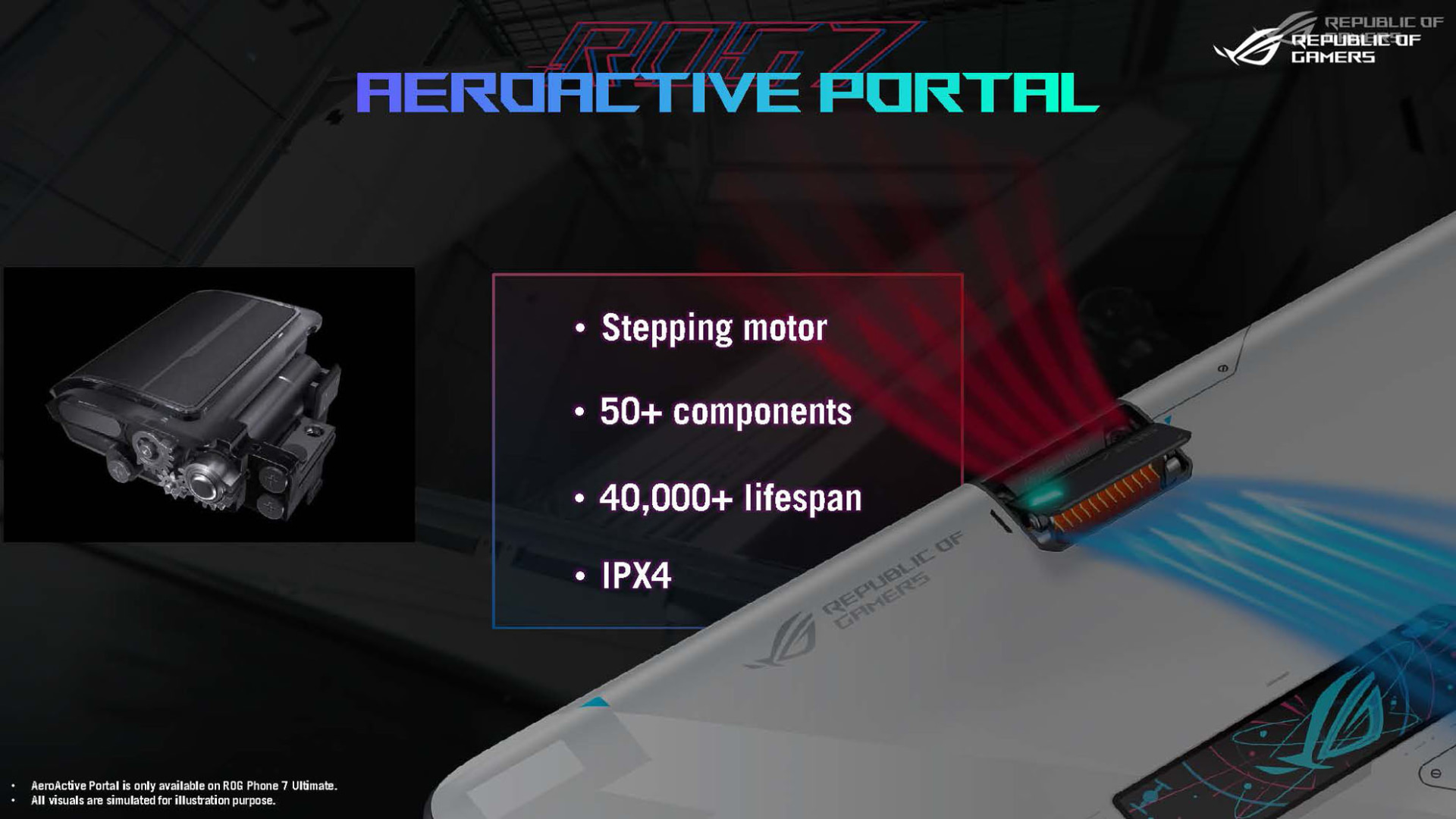 ROG Phone 7 Ultimateは、背面に開閉式のシャッターを搭載しており、外付けクーラー「AeroActive Cooler 7」を装着した時にシャッターが開放されて外気を取り込み内部を冷やすことができるとのこと。