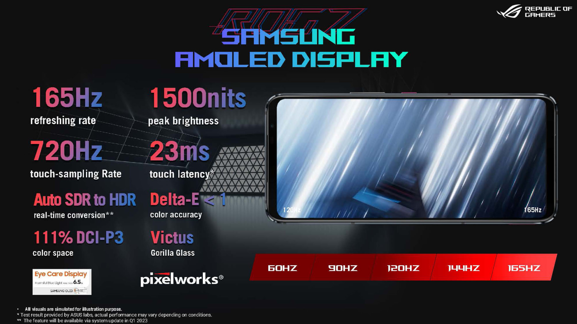 - ディスプレイ:6.78インチ(2448×1080・サムスン製AMOLED・ピーク輝度1500nits・Gorilla Glass Victus)、リフレッシュレート最大165Hz、タッチサンプリングレート720Hz、オートSDR/HDRサポート