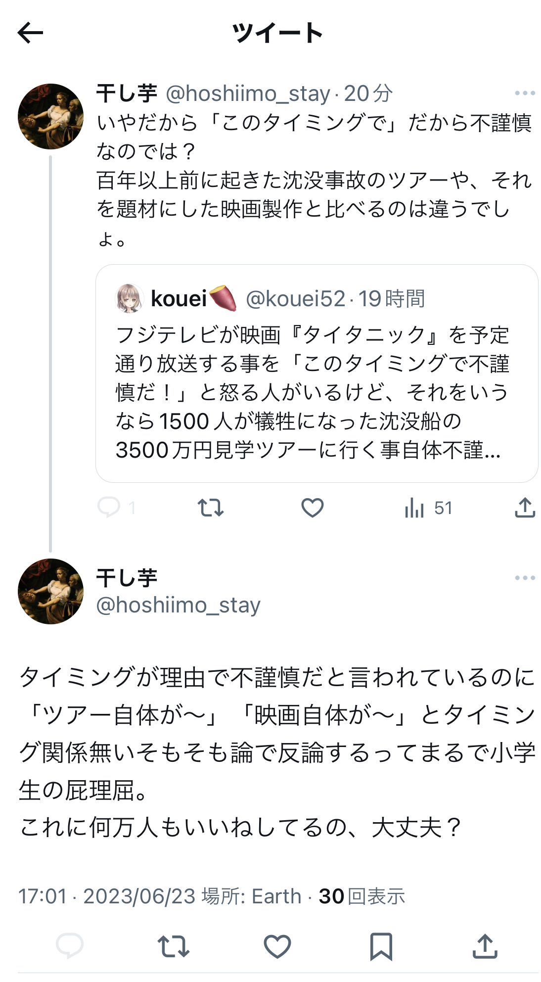 だとしたら映画タイタニック自体不謹慎だと批判すべきだよね