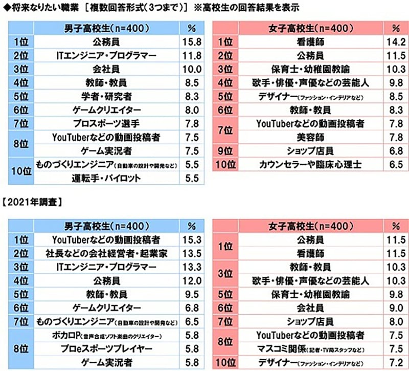 男子高校生がなりたい職業1位「YouTuber」→「公務員」に激変。若者の貧困化で「夢」に暗雲か