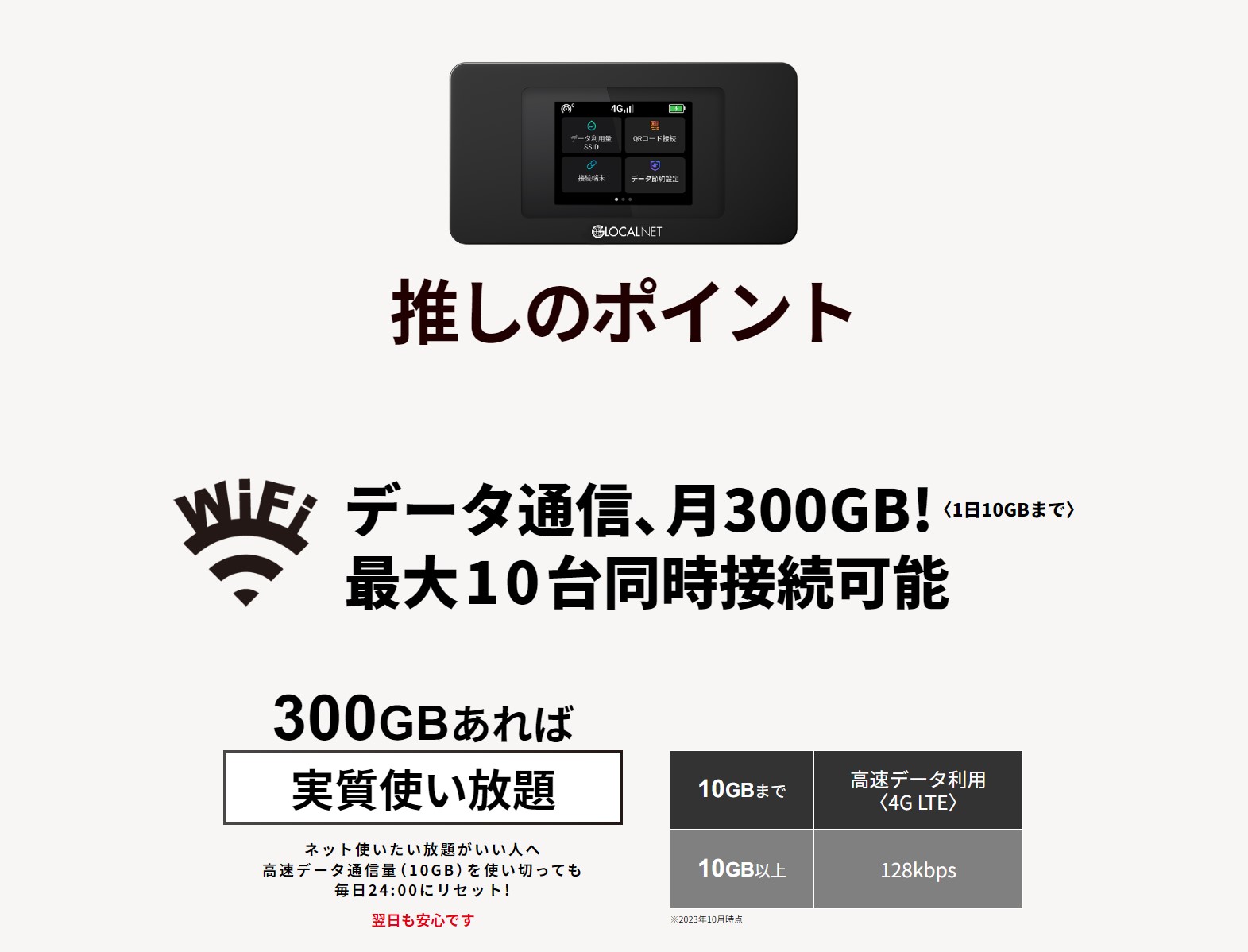 データ容量:月300GB、1日10GBまで(10GBを使い切った場合は128kbps)