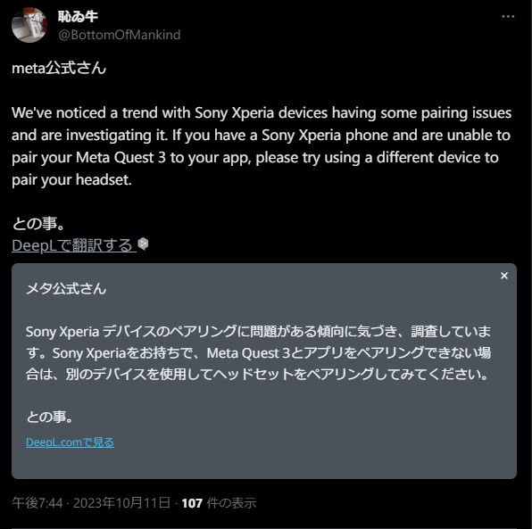 X見てたらXperia問題はMeta公式も認識してるんだな