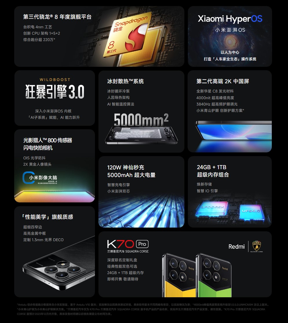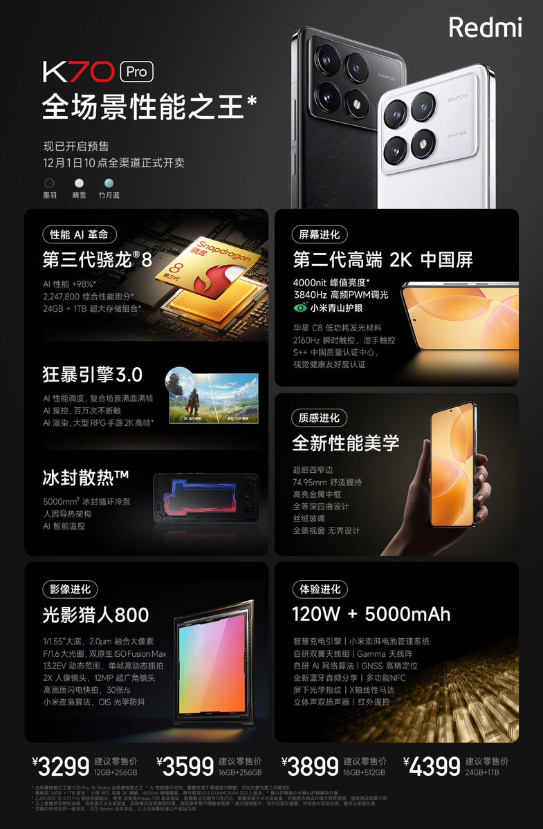 中国のメーカー Xiaomiは11月29日、Snapdragon 8 Gen 2搭載で120W充電対応のスマートフォン「Redmi K70」と、Snapdragon 8 Gen 3搭載で120W充電に対応したスマートフォン「Redmi K70 Pro」を中国で発表しました。