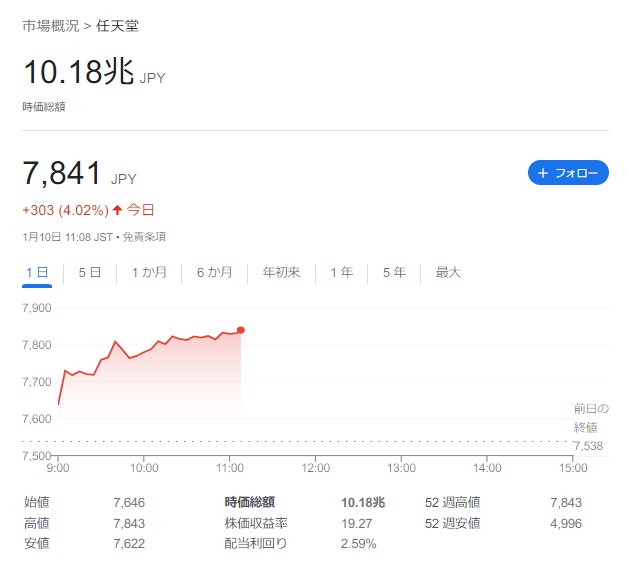 任天堂時価総額10兆超えたの ファー(´・ω・`)