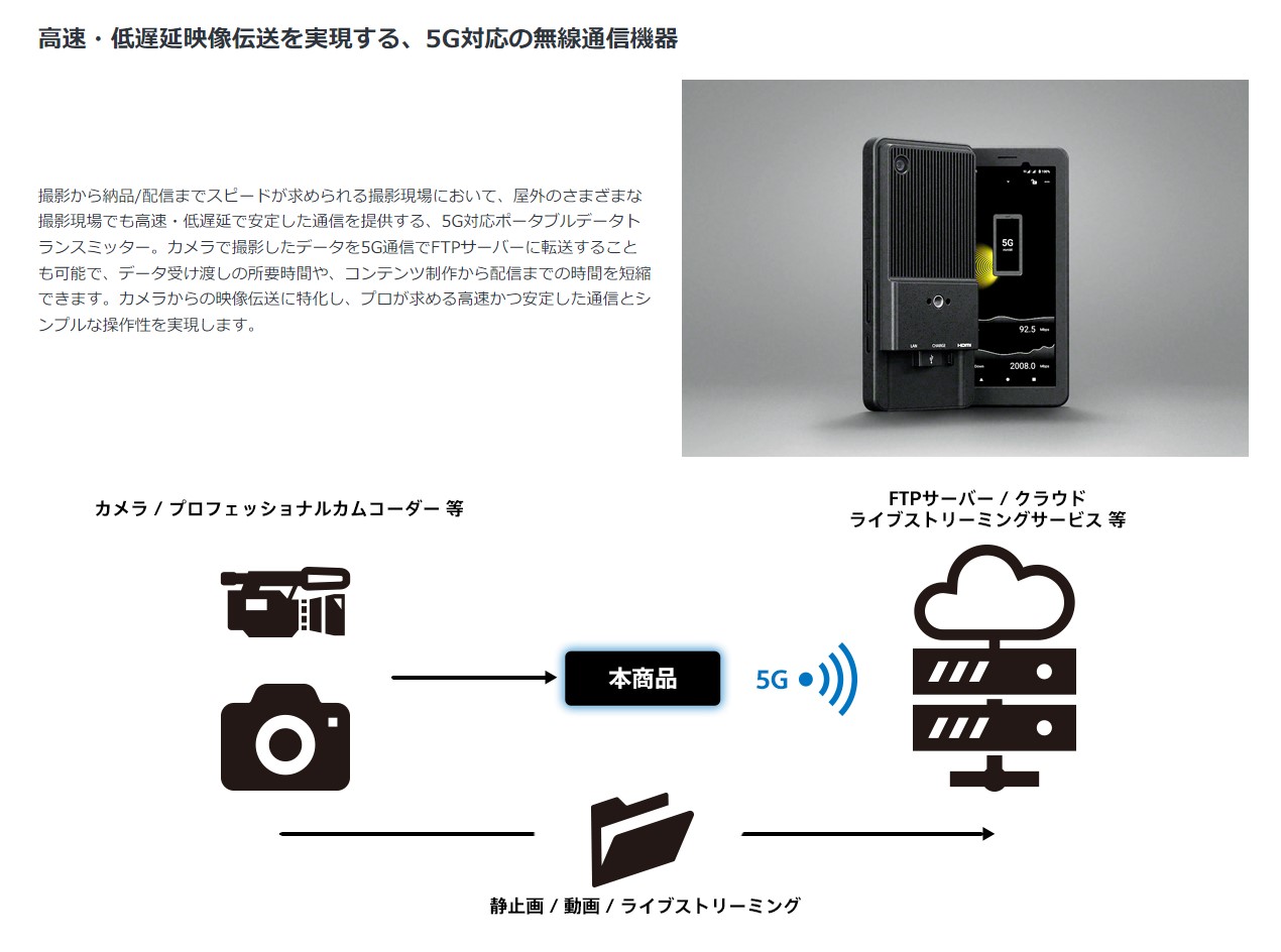 高速・低遅延映像伝送を実現する5G対応ポータブルデータトランスミッター『PDT-FP1』を発売します。報道写真や放送映像制作など、撮影から納品、放送や配信までスピードが求められる現場で活用する無線通信機器です。