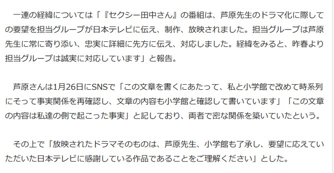 小学館目線ではドラマは芦原先生の了承が得られたもので日テレには感謝しているというスタンスやからな
