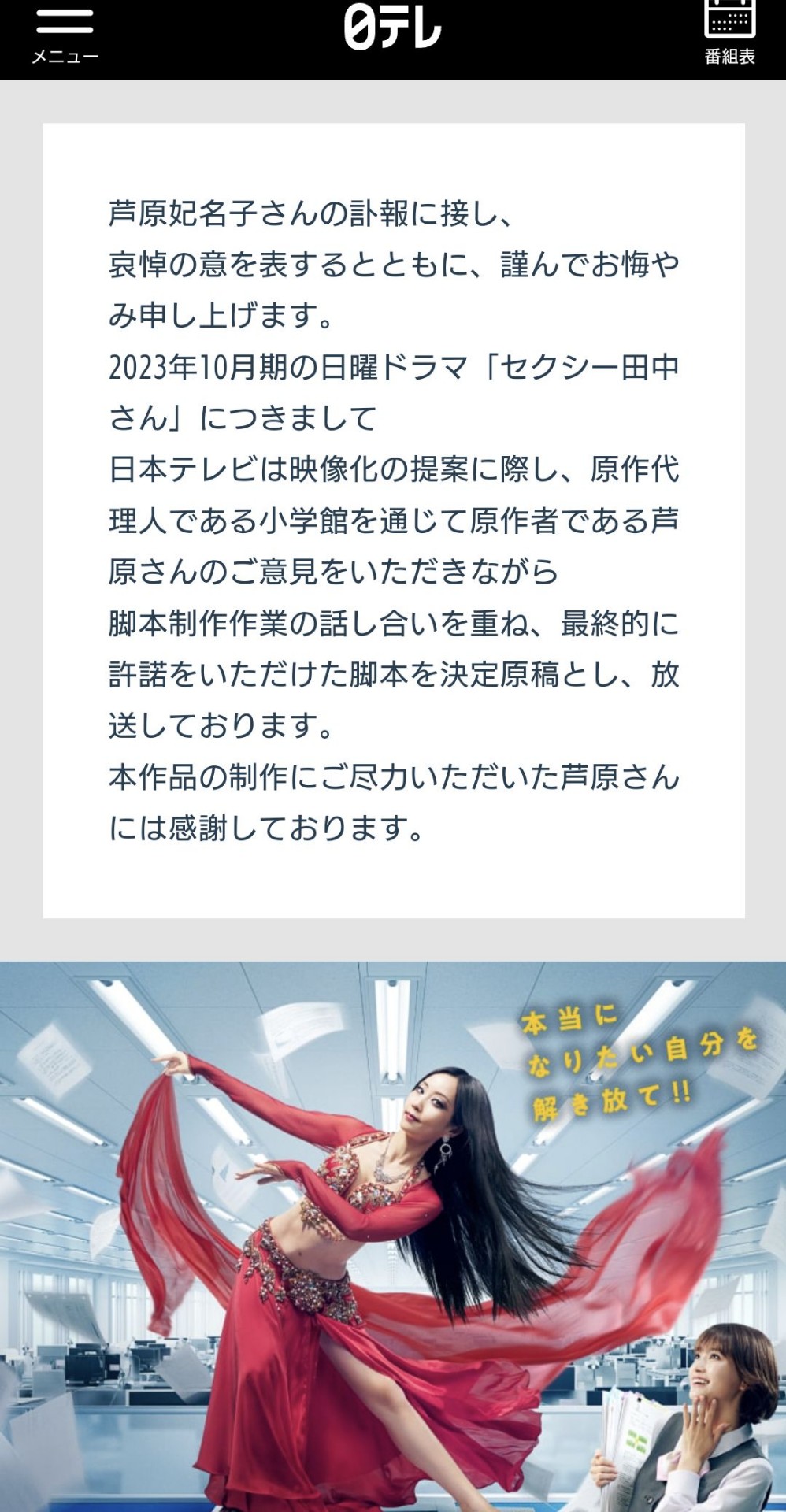 『セクシー田中さん』の映像化については、芦原先生のご要望を担当グループがドラマ制作サイドに、誠実、忠実に伝え、制作されました。しかしながら、今回のような事態となったことは痛恨の極みです。二度とこうした悲劇を繰り返さないために、現在、調査を進めており、今後、再発防止に努めて参ります。