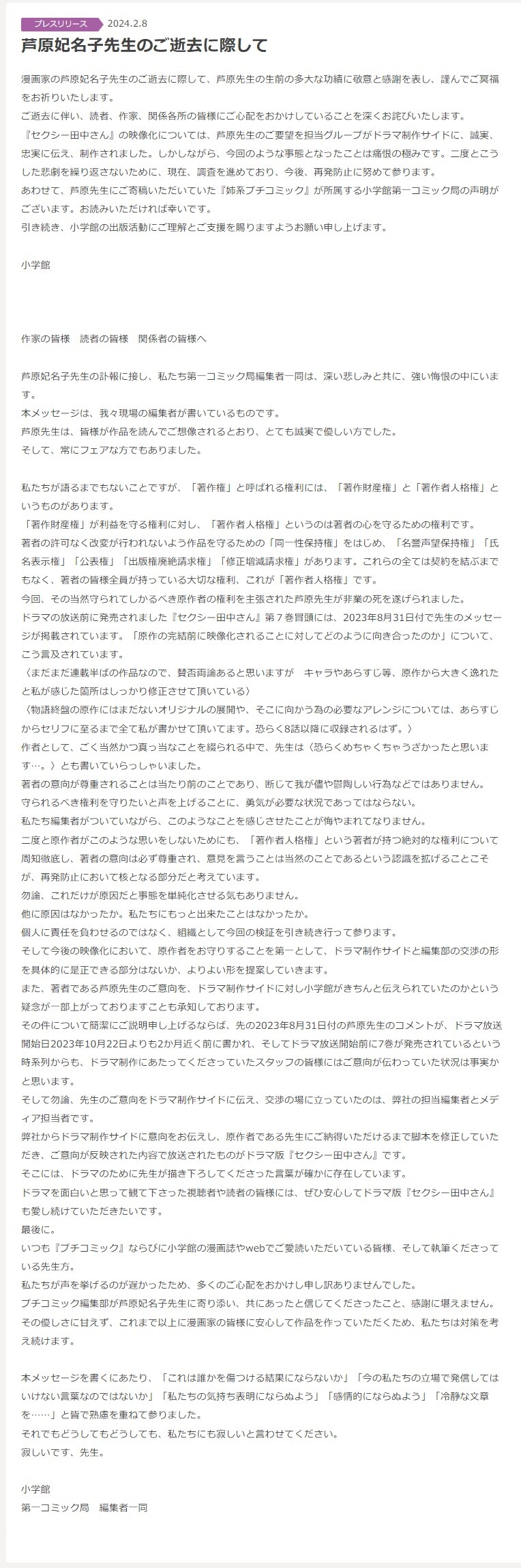 あわせて、芦原先生にご寄稿いただいていた『姉系プチコミック』が所属する小学館第一コミック局の声明がございます。お読みいただければ幸いです。