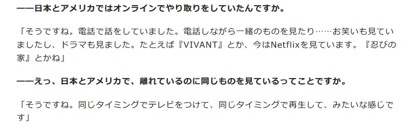 「そうですね。電話で話をしていました。電話しながら一緒のものを見たり……お笑いも見ていましたし、ドラマも見ました。たとえば『VIVANT』とか、今はNetflixを見ています。『忍びの家』とかね」