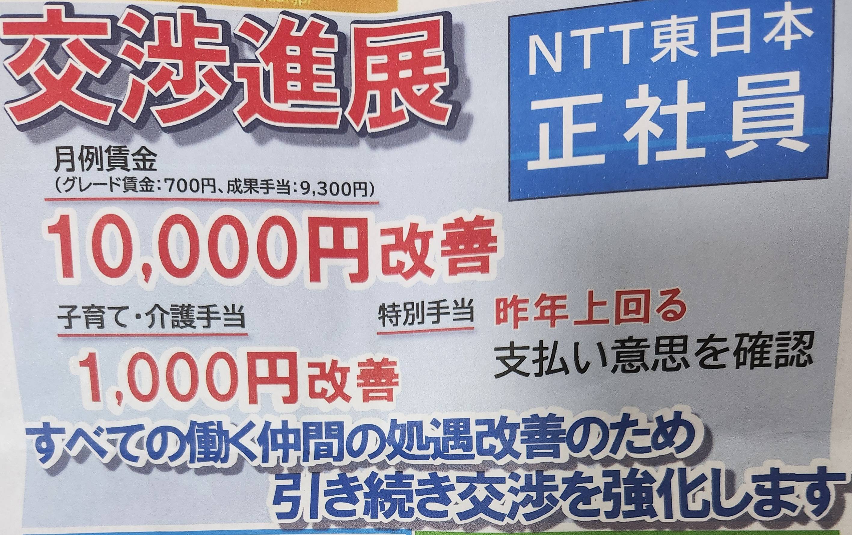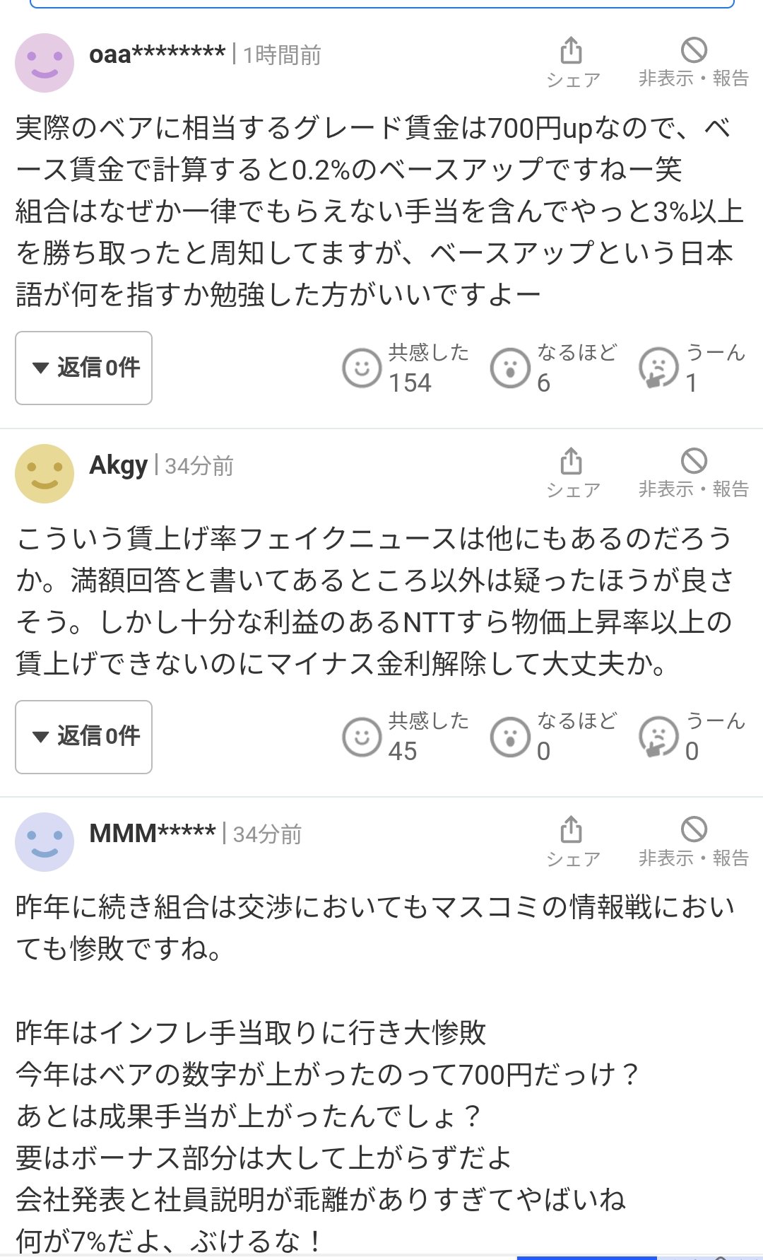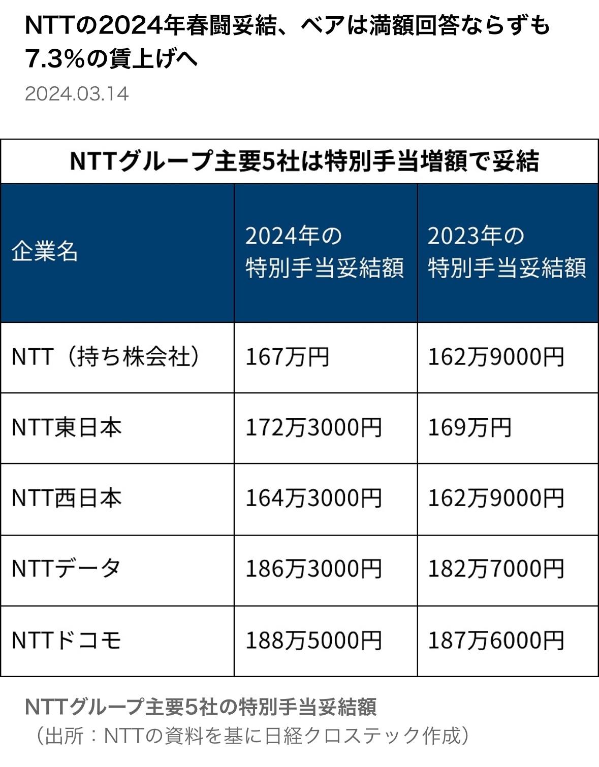 NTT労働組合は5%のベアを要求していたものの、2.1%と満額回答にはならなかった。NTTは「労使の真摯な交渉の結果であり、一定の評価ができるものと考える」とコメントした。
