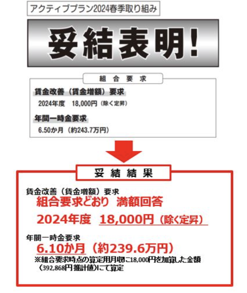 ベースアップ(ベア)に相当する月例賃金改定(子育て・介護手当を含む)は1万1000円、査定昇給を合わせると過去最高となる2万7000円の引き上げとなった。さらに「人事・人材育成・処遇等の見直し」制度による賃金増などを含めると3万9300円の引き上げで、2023年からの改定率は7.3%だった。2022年から2023年の改定率は5.9%だった。