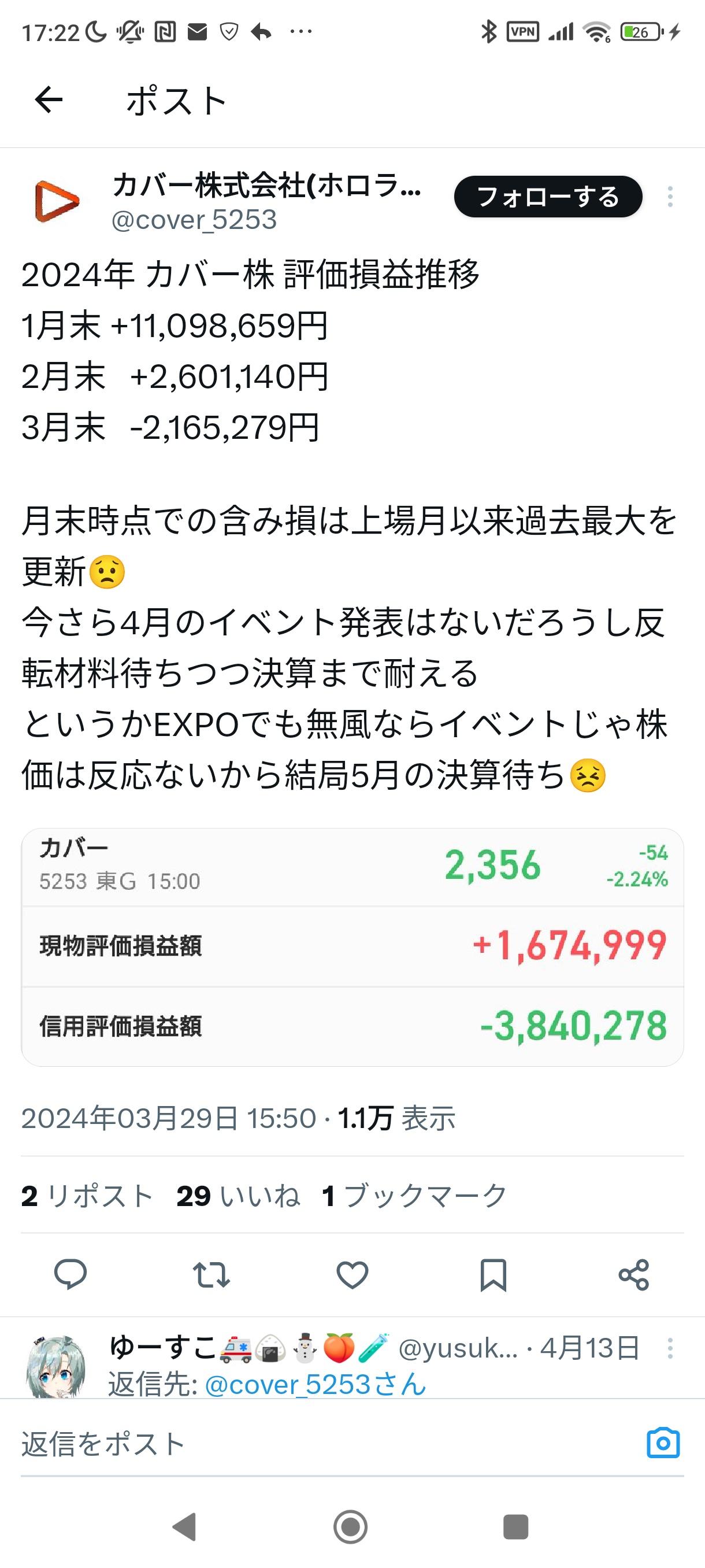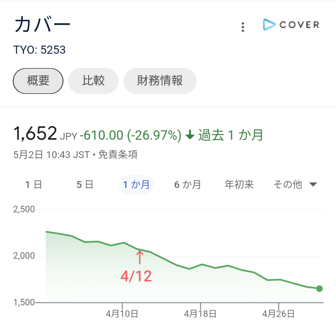 関連株ってことでエニカラーが下がれば道連れくらってカバーも下がるしね