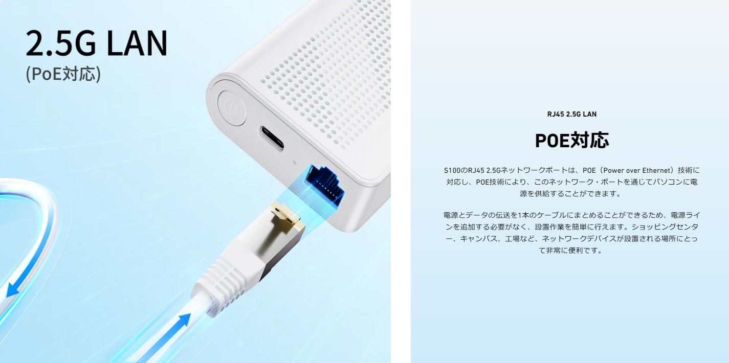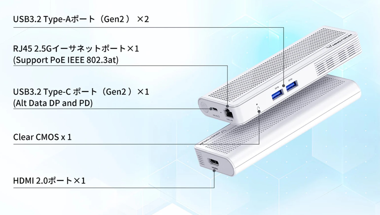 - インターフェース:HDMI2.0(4K@60Hz)、USB 3.2 Gen 2 Type-C(Alt Data DP and PD、4K@60Hz出力)、USB 3.2 Gen 2 Type-A×2、LAN(2500Mbps、PoE IEEE 802.3at 対応)
