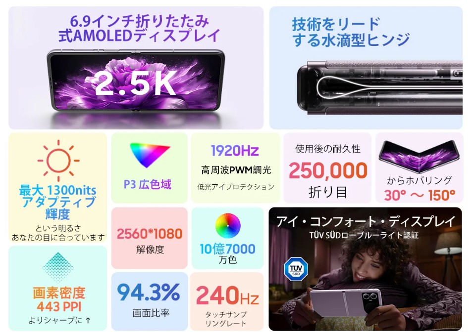 - ディスプレイ:6.9インチ(2.5k・AMOLED・最大1300nits)