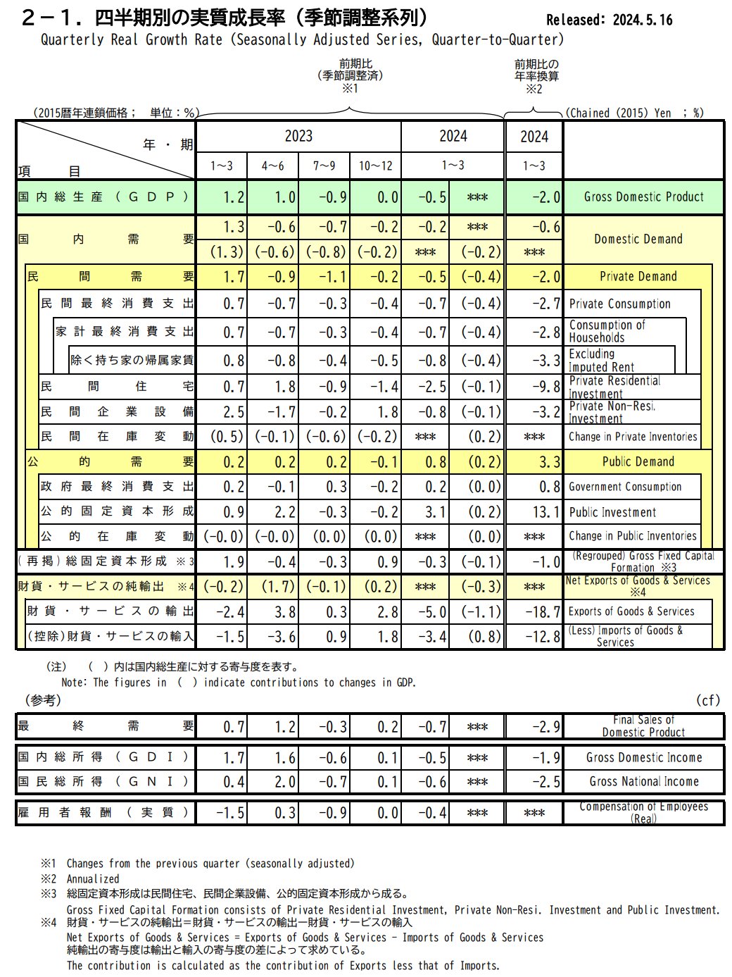 ・1Q日本 実質GDP(前期比年率)-2.0%(予想 -1.2%・前回 0.4%)