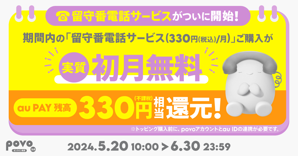 2024年6月30日までに、povoアカウントとau IDを連携のうえ、留守番電話サービス加入で、月額料金相当である330円相当のau PAY 残高を還元するキャンペーンを実施します。留守番電話サービスを実質初月無料でご利用いただけます。特典は2024年7月末までに還元予定です。