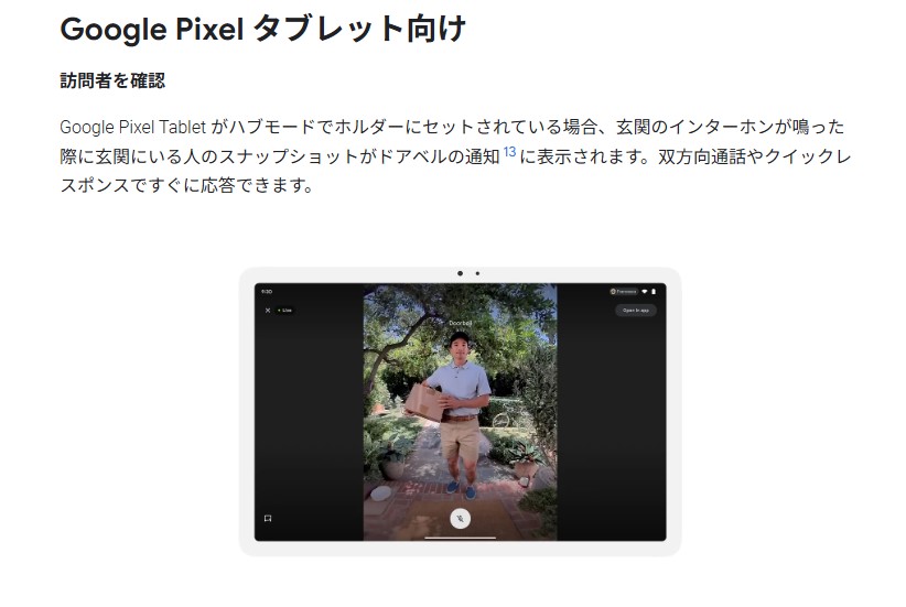 Pixel Tablet がハブモードでホルダーにセットされている場合、玄関のインターホンが鳴った際に玄関にいる人のスナップショットがドアベルの通知に表示。双方向通話やクイックレスポンスですぐに応答可能