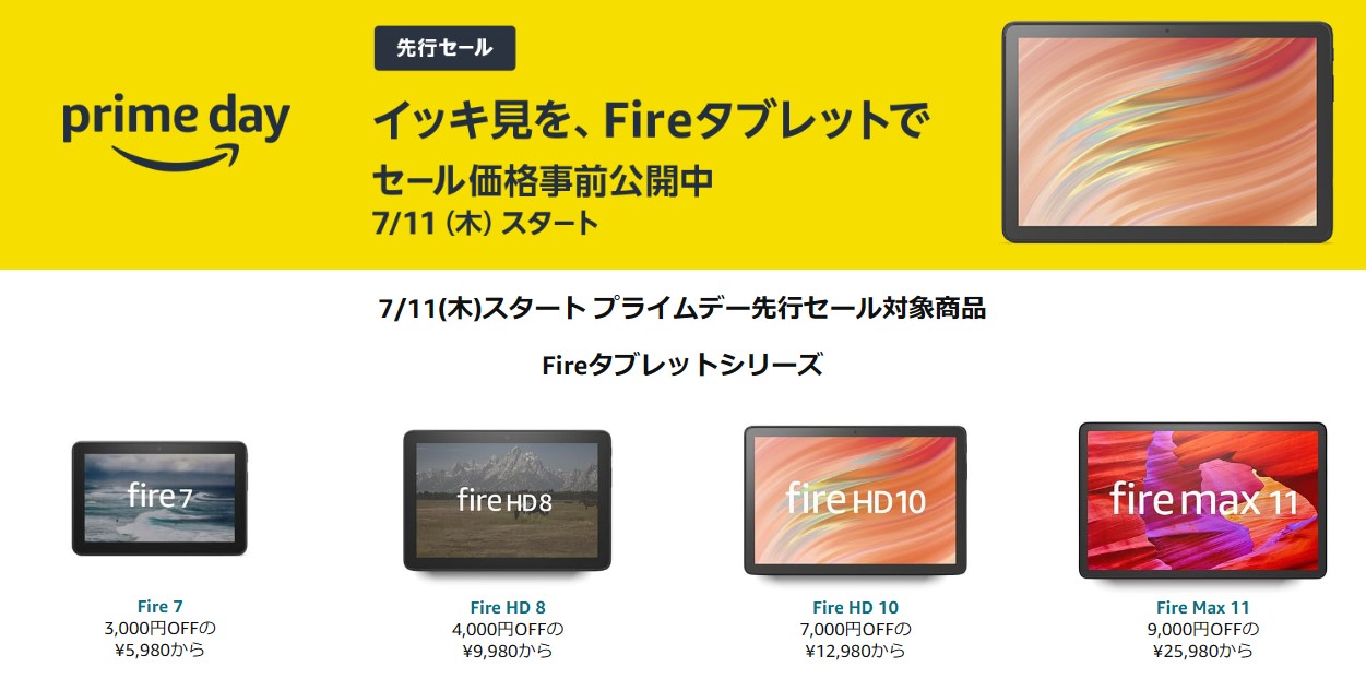 プライムデー Fireタブレットセール価格事前公開 7/11~