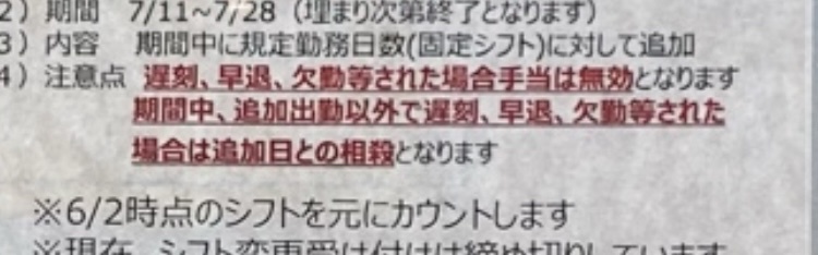 7月11日から28日までの間に15日10時間勤務で出勤すると12000円!!