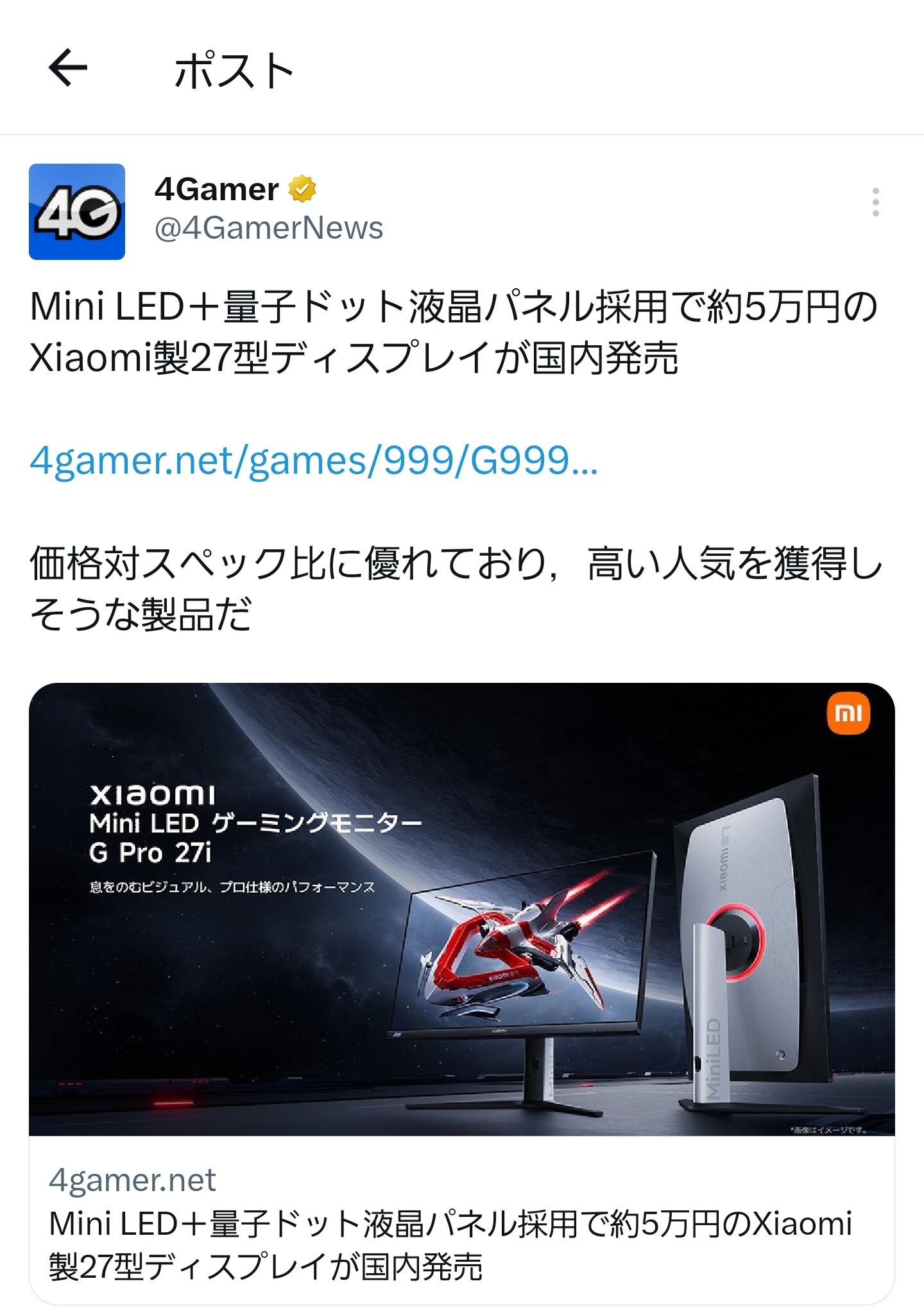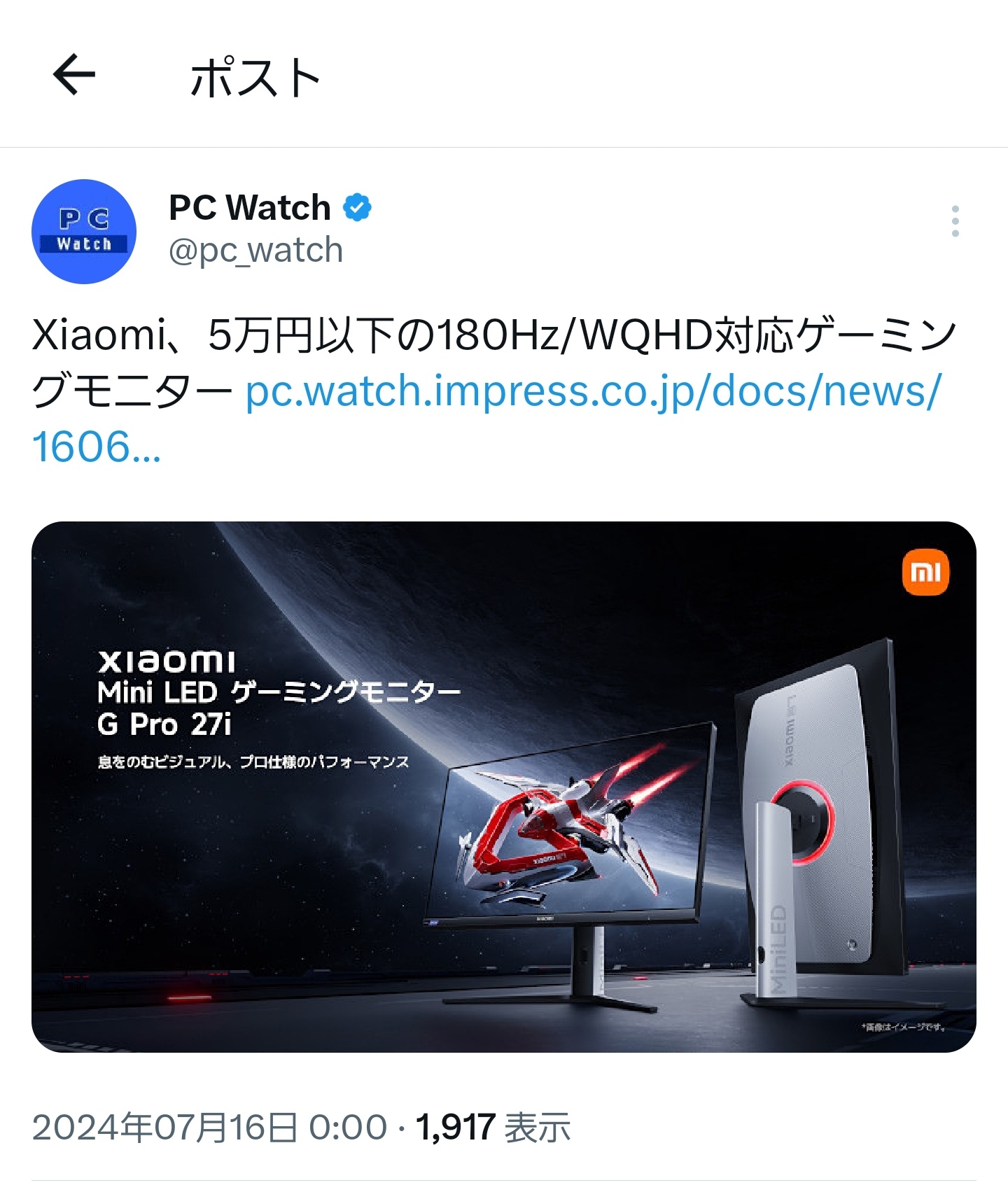 Xiaomi Japanは7月16日、Mini LEDバックライトを採用した180Hz対応・27インチWQHDゲーミングモニタ「G Pro 27i」を7月24日に発売すると発表しました。価格は4万9980円、7月24日までは4万7980円で購入できます。