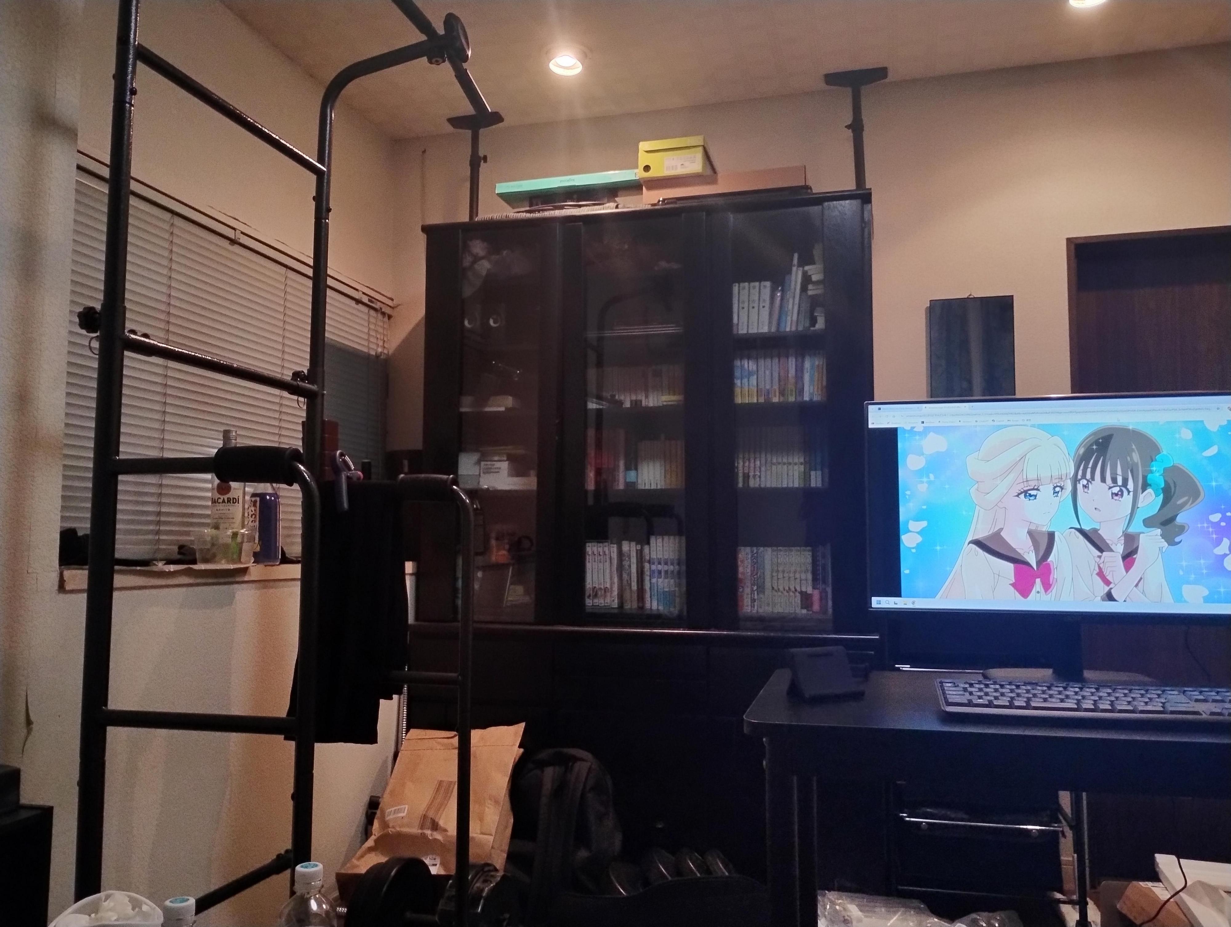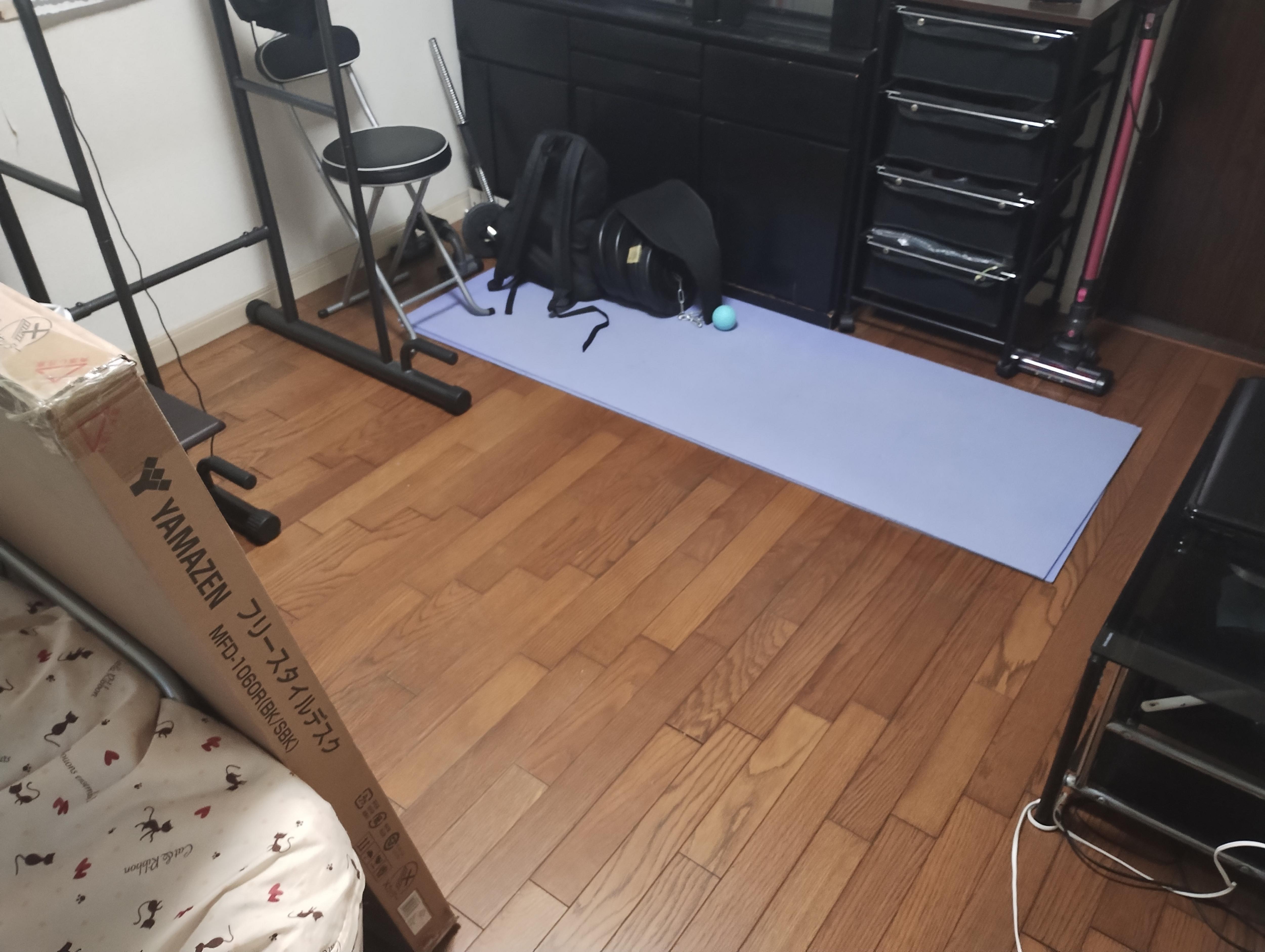 懸垂台と筋トレスペース確保のせいで真ん中に置くしかないんや
