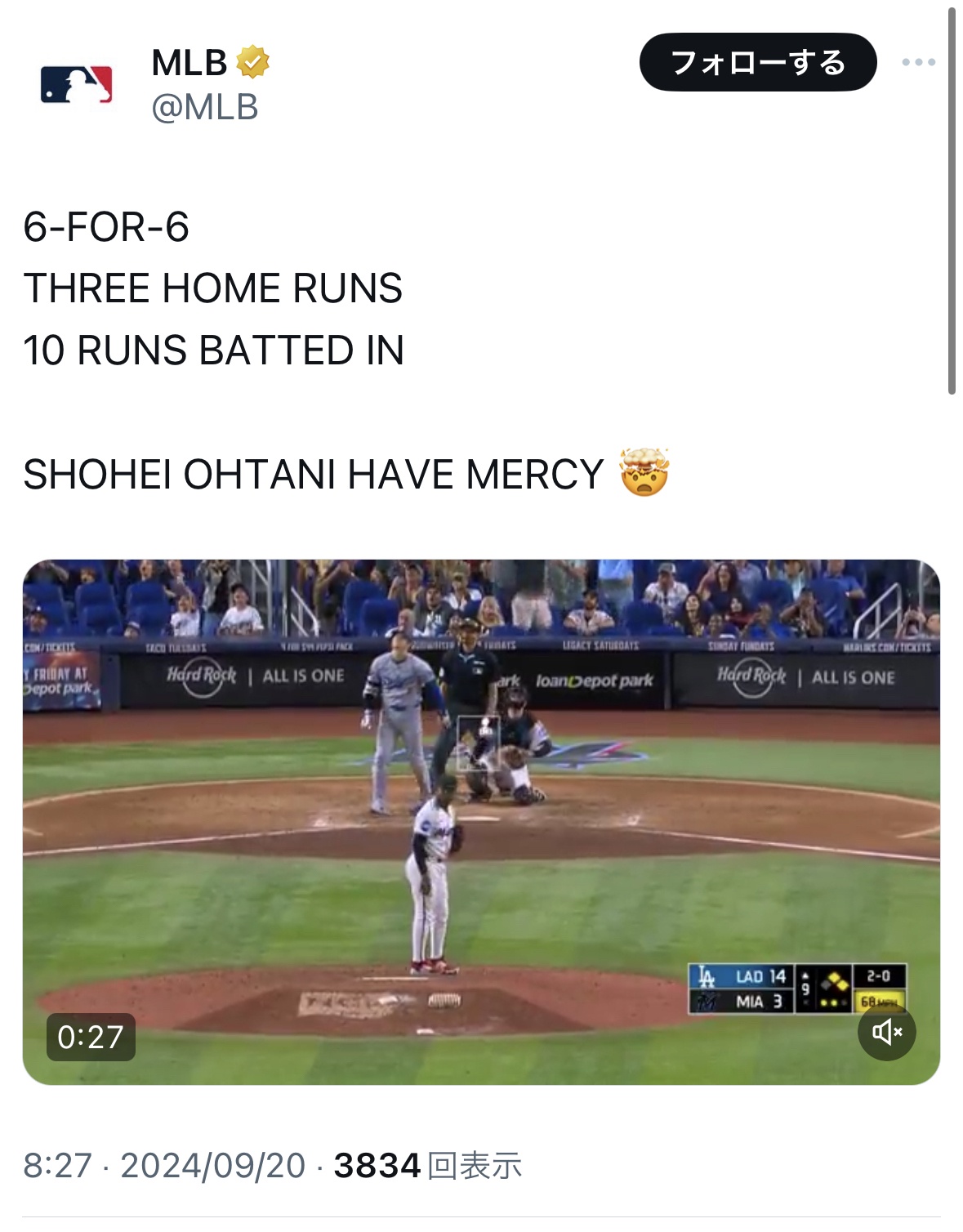 6打数6安打3本塁打10打点2盗塁wwwwwwww