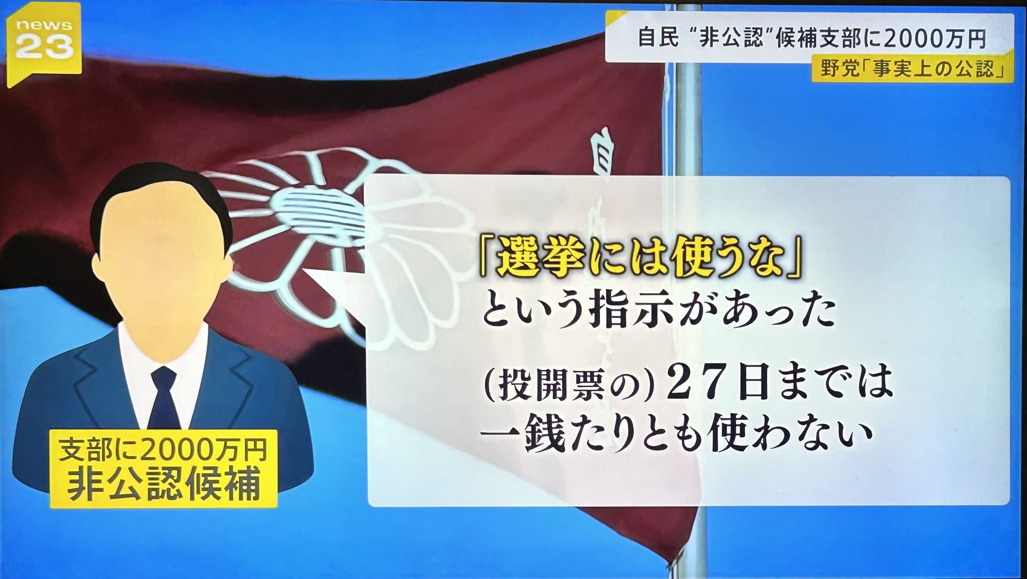 自民党非公認候補「確かに2000万貰いました😤でも選挙期間中は一銭も使いません!セーフ!」