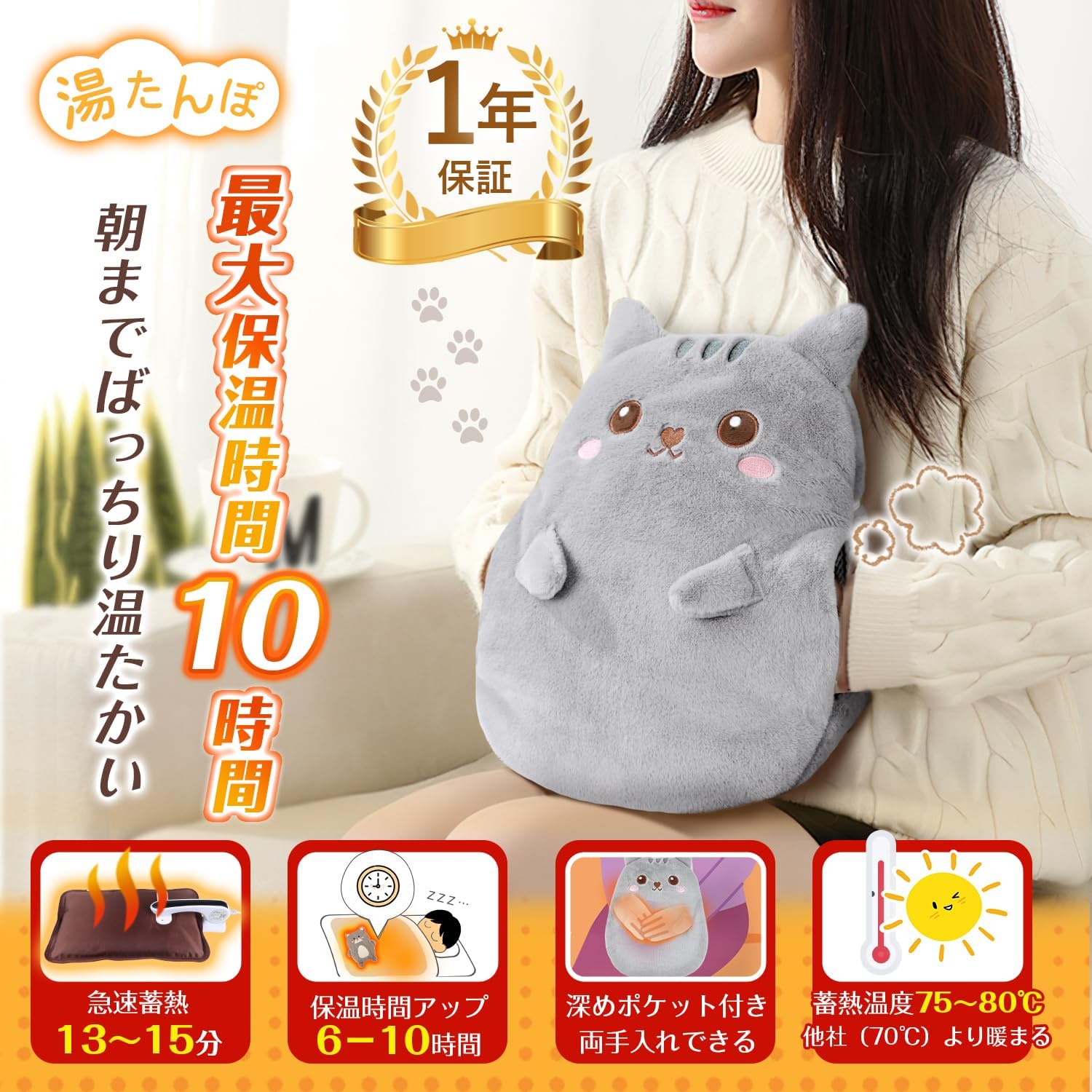 湯たんぽ 充電式 湯タンポ 蓄熱式【保温ポケット型デザイン】ゆたんぽ 3~8H長時間保温 両手入れ 防爆充電器 過熱防止 急速充電 節電 エコ 省エネ あったかグッズ 防寒グッズ 冷え対策 動物柄 ふわふわカバー お湯不要 洗濯可能 暖房器具 お腹/背中/指先/足元 安全PSE認証 ギフト お祝い プレゼント (ねこ(グレー))