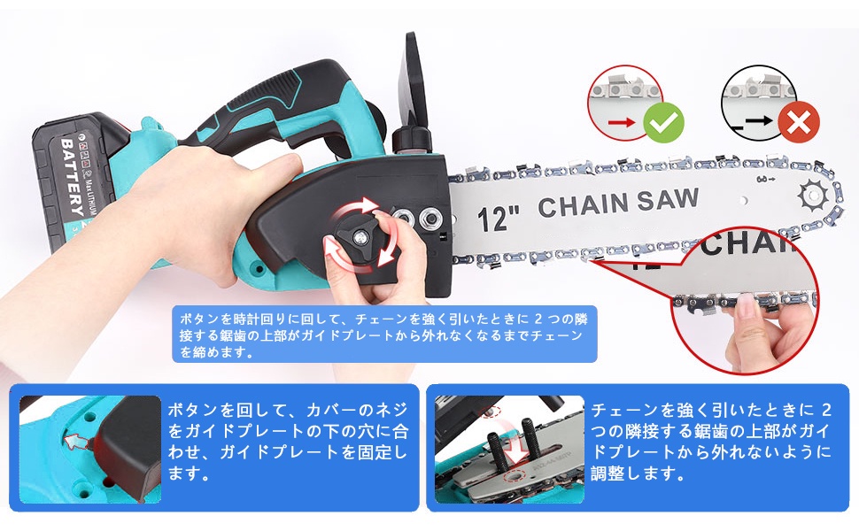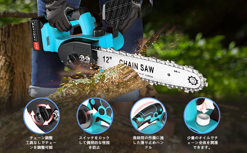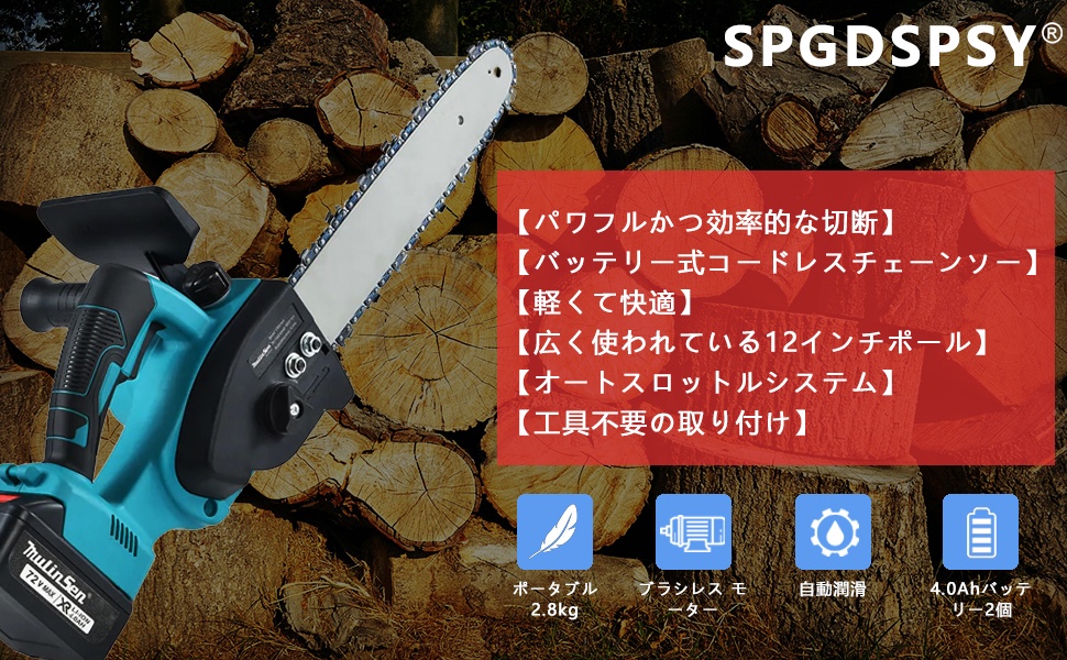 チェーンソー 充電式 コードレス 12インチ 切断径300mm 互換マキタ 18V バッテリー 自動給油 ブラシレスモーター 2つ4.0Ahのバッテリー 電動ノコギリ ポータブル ハンディ ミニ 電動のこぎり 日本語取扱説明書