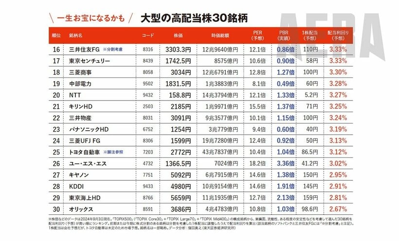 大型の高配当株30銘柄