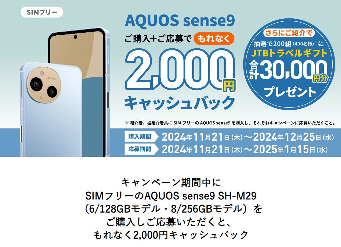 キャンペーン期間中に SIMフリーのAQUOS sense9 SH-M29 (6/128GBモデル・8/256GBモデル)を ご購⼊しご応募いただくと、 もれなく2,000円キャッシュバック