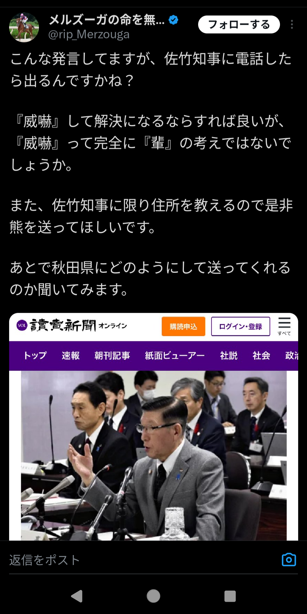 クマ対応に関して悪質なクレーム電話が県に寄せられているとして、 「もし私が電話を受けたら完全に相手を威嚇し、『お前の所に今(クマを)送るから住所を送れ』と言う。 知事が言うと悪いかもしれないが、話して分からない人に付き合う必要はない」と述べた。