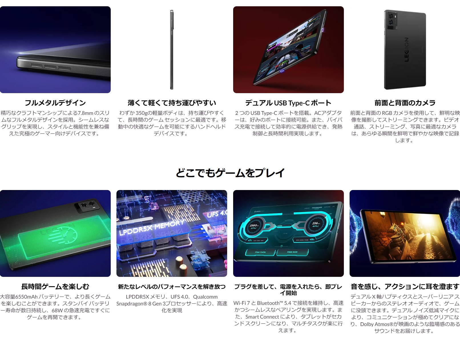 Lenovoは1月8日、Snapdargon 8 Gen 3搭載の8.8インチゲーミングタブレット「Legion Tab 8.8(Gen3)」、Snapdargon 8 Gen 3搭載の12.7インチAndroidタブレット「Yoga Tab Plus」、Dimensity 8300搭載の12.7インチAndroidタブレット「Idea Tab Pro」を発売しました。