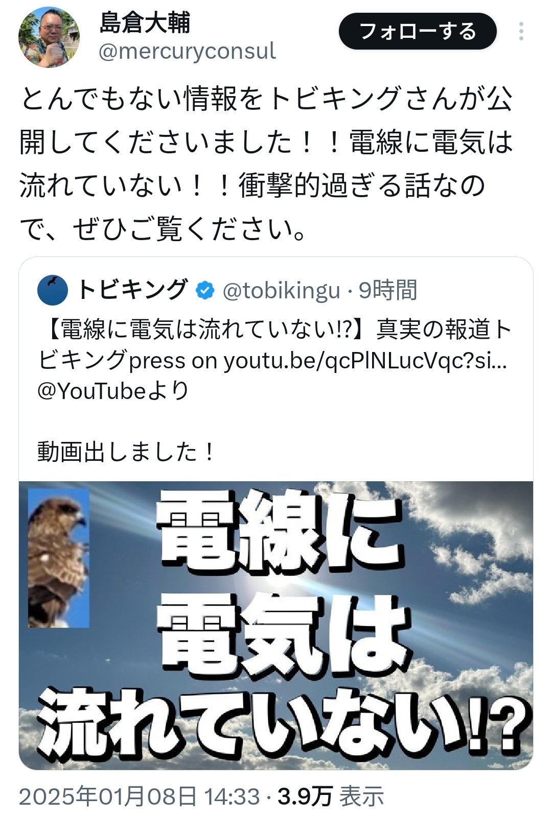 鳥は電気料金払ってないから通電しない