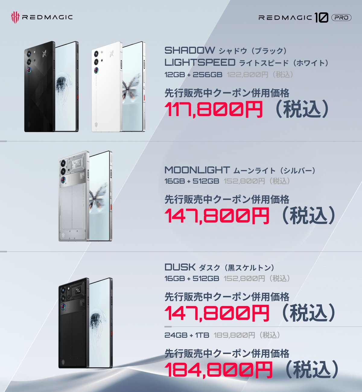 - 価格:12GB+256GBが12万2800円、16GB+512GBが13万9800円、公式サイト限定のスターレイナイト(16GB+512GB)が14万9800円、先行販売クーポンで5000円OFF、1月15日12時~21日11時59分にメール登録した人に1000円OFFクーポン